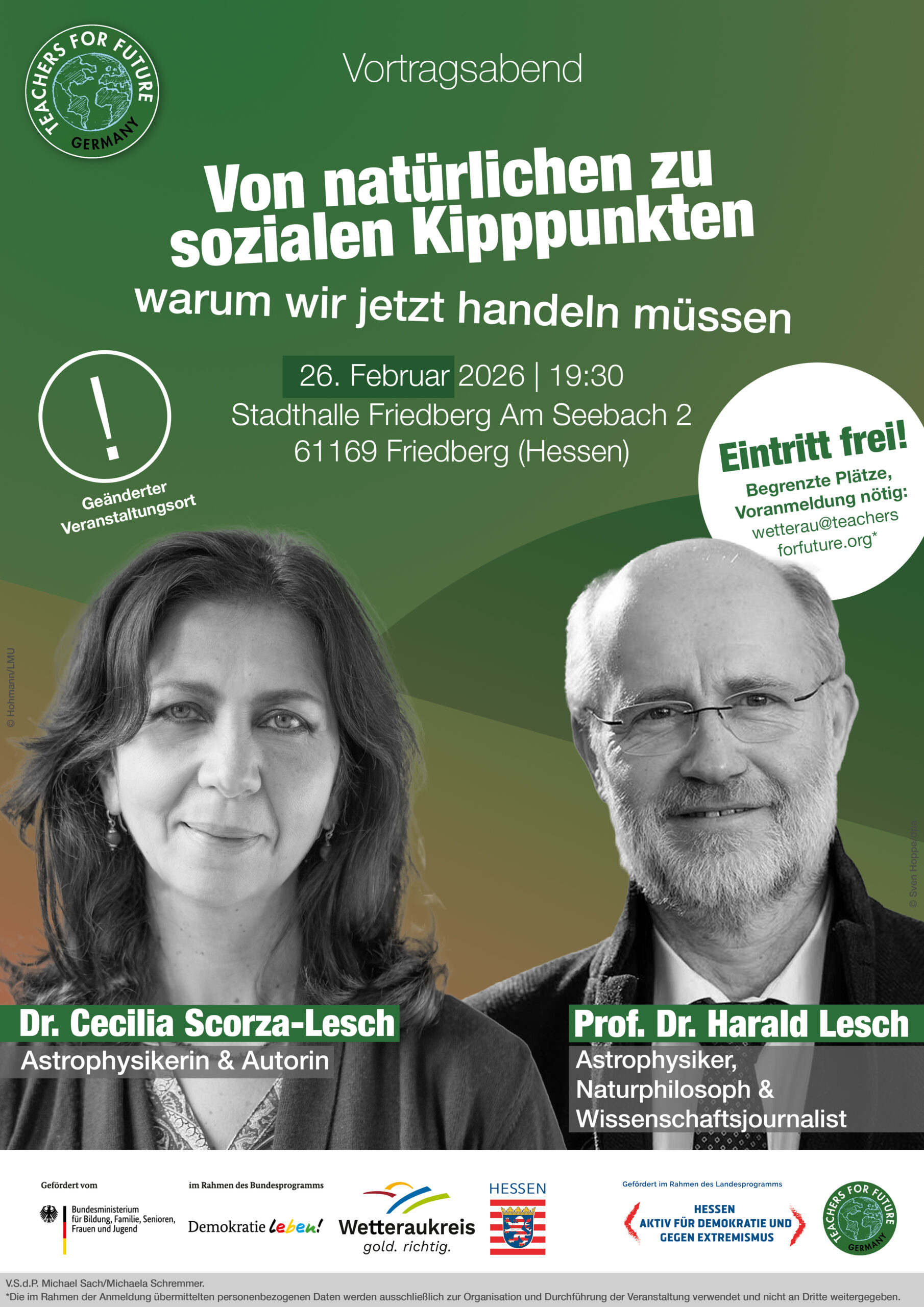 Weiterlesen: Vortragsabend: „Von natürlichen zu sozialen Kipppunkten — warum wir jetzt handeln müssen“Die Vortragenden Der Physiker, Wissenschaftsjournalist, Fernsehmoderator und AutorProf. Dr. Harald Lesch steht für eine verständliche und mitreißendeVermittlung wissenschaftlicher Erkenntnisse. Die Astrophysikerin Dr. Cecilia Scorza-Lesch ist…