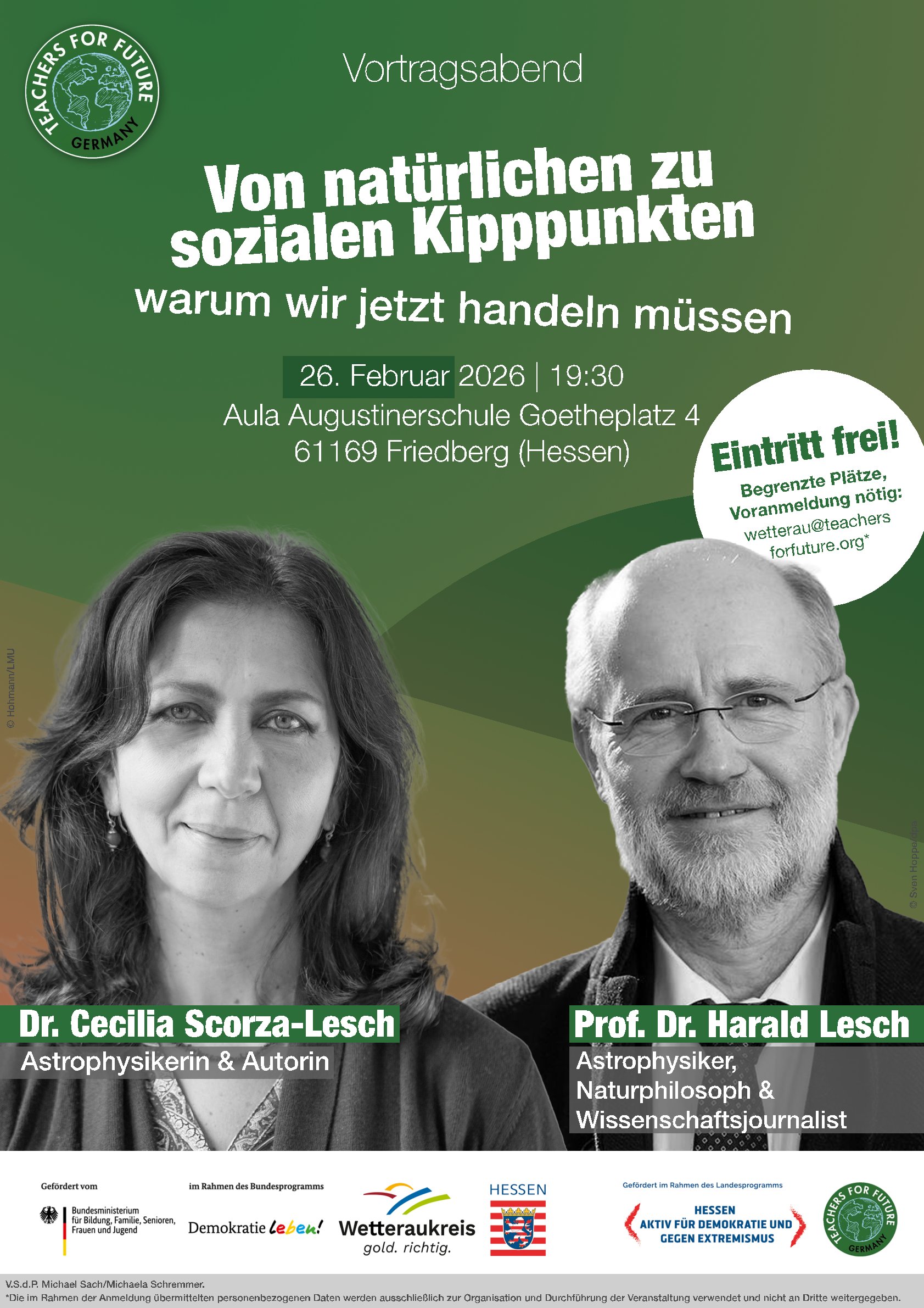 Weiterlesen: Vortragsabend Von natürlichen zu sozialen Kipppunkten — warum wir jetzt handeln müssenDie Vortragenden Der Physiker, Wissenschaftsjournalist, Fernsehmoderator und AutorProf. Dr. Harald Lesch steht für eine verständliche und mitreißendeVermittlung wissenschaftlicher Erkenntnisse. Die Astrophysikerin Dr. Cecilia Scorza-Lesch ist Projektleiterin desBildungsprogramms „Klimawandel: verstehen und handeln“ undhat ein bundesweites Lehrkräftenetzwerk aufgebaut. Der Vortragsabend Warum über natürliche und soziale Kipppunkte sprechen? Die Industrialisierung hat durch den Ausstoß von Treibhausgasen zu einer…
